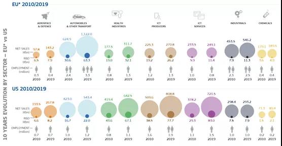 我們再看下歐美這兩大巨頭,從2010年到2019年,不同行業(yè)的公司營收和研發(fā)支出變化情況,大圓圈是公司營收,里面的小圈是研發(fā)支出,相同顏色的兩個(gè)圈表示2010年和2019年。