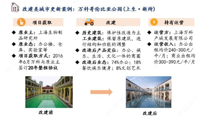 改建類項目改造力度居中、一般需由市級城市更新管理部門審批,房企一般可通過改造、持有運營的等方式參與項目。改建類項目一般不改變土地使用權(quán)的權(quán)力主體和使用期限,在不全部拆除的前提下進行局部拆除或加建,可實施土地用途變更,部分城市可增加建筑面積(但一般會對建筑面積增幅設(shè)限,例如珠海要求不超過30%)。房企可通過改造、持有運營等方式參與項目,代表案例如萬科上海哥倫比亞公園。