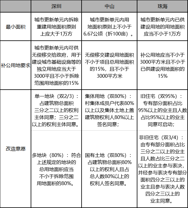 指項目申請納入“城市更新單元計劃”。申報主體可以為權(quán)利主體(如村委會等)、由權(quán)利主體委托的市場主體(如房企)、或市/區(qū)政府,項目申報需滿足一定前提,如達到最小改造規(guī)模、補公用地達到一定比重、改造意愿滿足條件等。其中,改造意愿征集是立項前的關(guān)鍵步驟,不同城市要求有所不同,如深圳為單地塊“雙2/3”,珠海為舊住宅“雙95%”,非舊住宅“雙3/4”。在完成意愿征集后,申報主體可向區(qū)更新辦提交申報材料,經(jīng)區(qū)、市兩級審批后項目納入“城市更新單元計劃”,標志立項成功。