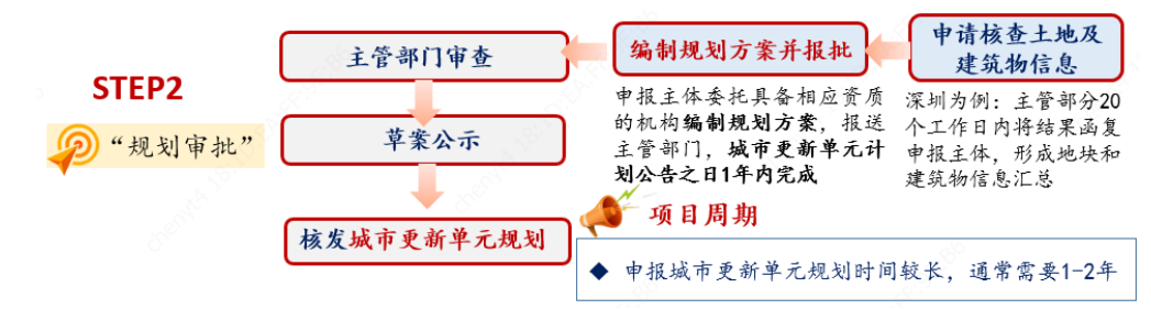 指“城市更新單元規(guī)劃”的編制和審批,通常需在立項公告后一定時限內(nèi)完成方案報送,如深圳要求1年。在這一流程中,申報主體一般首先向主管部門申請核查土地及建筑物信息,再聘請有資質(zhì)的規(guī)劃設(shè)計單位編制規(guī)劃方案,并與規(guī)劃國土部門深入溝通、報審,以獲得對公司有利的批復(fù)指標。專項規(guī)劃報批是房企就容積率、配建要求等與政府進行博弈的過程,通常需要耗時1-2年。