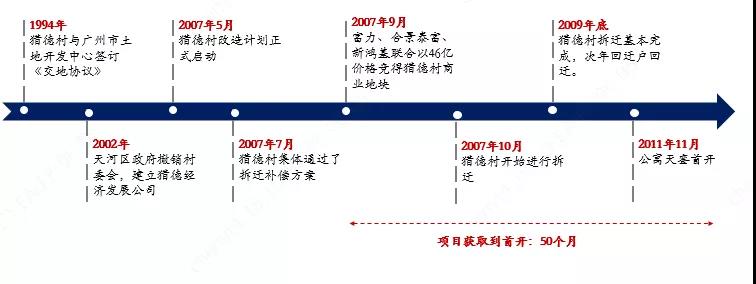 2007年9月,富力、合景泰富、新鴻基聯(lián)合以46億的價格競得獵德村西片區(qū)商業(yè)地塊,其中約25億用作拆遷款安置及新樓建設(shè)款,10億用于投資村南酒店。2007年10月獵德村開始進行拆遷,2009年底拆遷基本完成,2010年初回遷戶回遷至原村東片區(qū)。