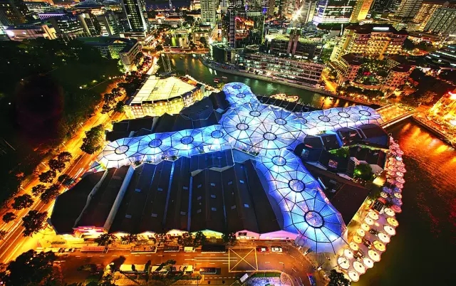 克拉碼頭的天棚是它的一大特色,綿延不絕的排布幾乎覆蓋了整個(gè)碼頭區(qū)域,來為氣候多變的新加坡遮風(fēng)擋雨。白天的頂棚,通透無奇;而一到夜晚,它也開始綻放出迷人的魔力,隨著節(jié)奏,變幻出不同的色彩,極具風(fēng)情。人類與生俱來便擁有“向光性”,克拉碼頭的商業(yè)地標(biāo)效應(yīng)在這燈光的映襯下,即刻間得到展示。加之原本就透視的玻璃幕墻內(nèi)映襯出的點(diǎn)點(diǎn)星光,休閑氛圍在克拉碼頭發(fā)揮得淋漓盡致。