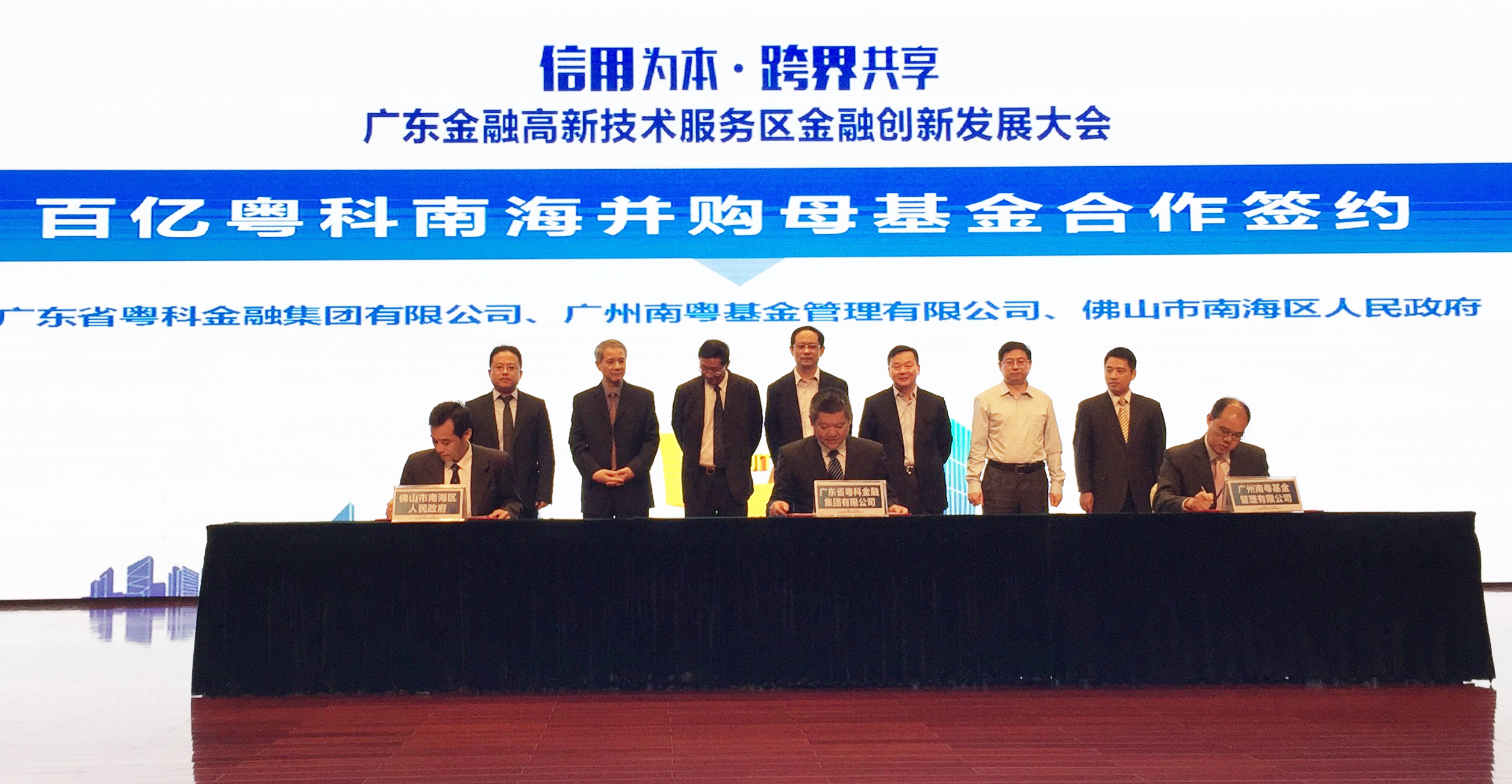 (見證嘉賓從左至右依次為南粵基金董事長林濤、省金融辦副主任張曉山、省粵科集團董事長侯外林、人行廣州分行行長王景武、佛山市市長朱偉、省科技廳副廳長楊軍、佛山市市委常委南海區(qū)委書記黃志豪,曾金賢總經(jīng)理代表南粵基金與粵科集團、南海區(qū)政府簽署合作協(xié)議)