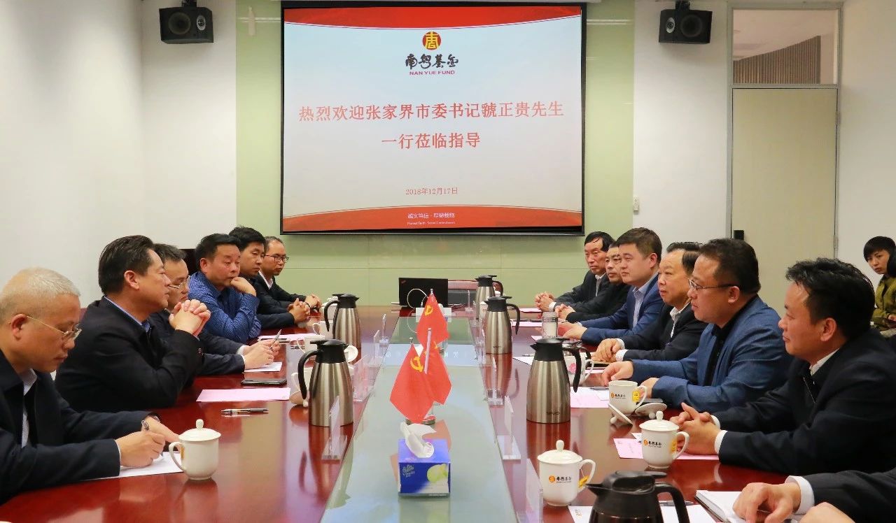 12月17日晚間,張家界市委書(shū)記、市人大常委會(huì)主任虢正貴一行來(lái)到廣州南粵基金集團(tuán)有限公司(簡(jiǎn)稱“南粵基金”)考察,并與南粵基金董事長(zhǎng)林濤進(jìn)行了會(huì)談。