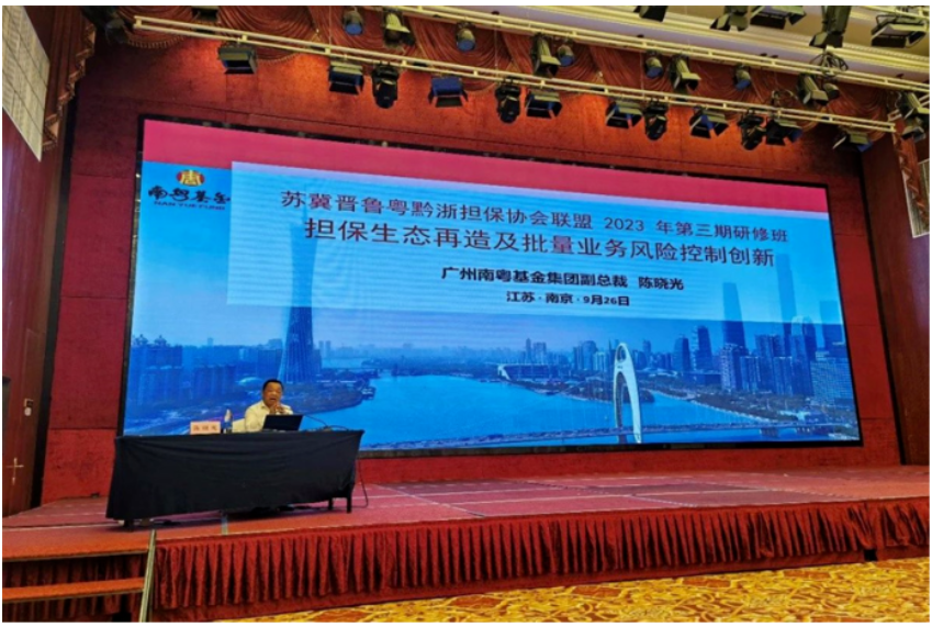 近日,由江蘇省信用擔(dān)保協(xié)會主辦的蘇冀晉魯粵黔浙七省擔(dān)保協(xié)會聯(lián)盟2023年第三期研修班在江蘇南京成功舉辦,南粵基金集團(tuán)副總裁、南粵國投董事長陳曉光作為特邀嘉賓出席活動并作主題演講。來自江蘇、河北、山西、山東、廣東、貴州、浙江以及安徽、青海和新疆等10個省份200多家擔(dān)保機構(gòu)近300人參加此次培訓(xùn)。