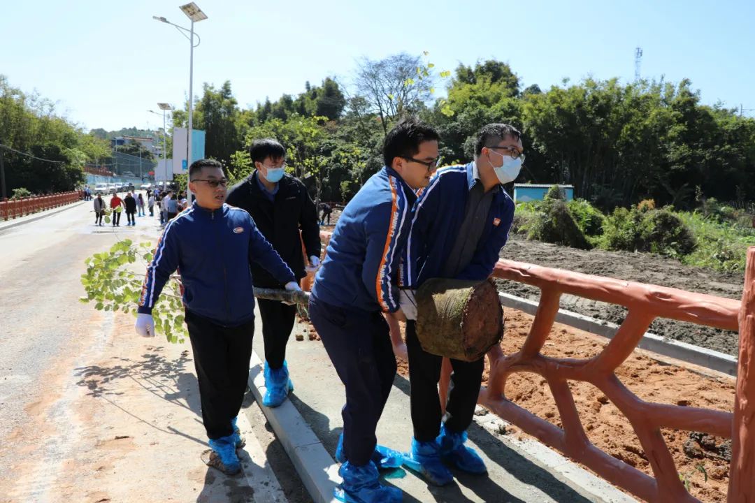 活動(dòng)現(xiàn)場,大家熱情高漲,揮鍬鏟土、扶苗填坑、提水澆灌,分工協(xié)作、干勁十足,有條不紊完成每道工序。經(jīng)過共同努力,50余株紫花風(fēng)鈴木、紫荊和風(fēng)鈴等青苗挺拔樹立,為原本空曠的道路增添了一抹抹生機(jī)和綠意。