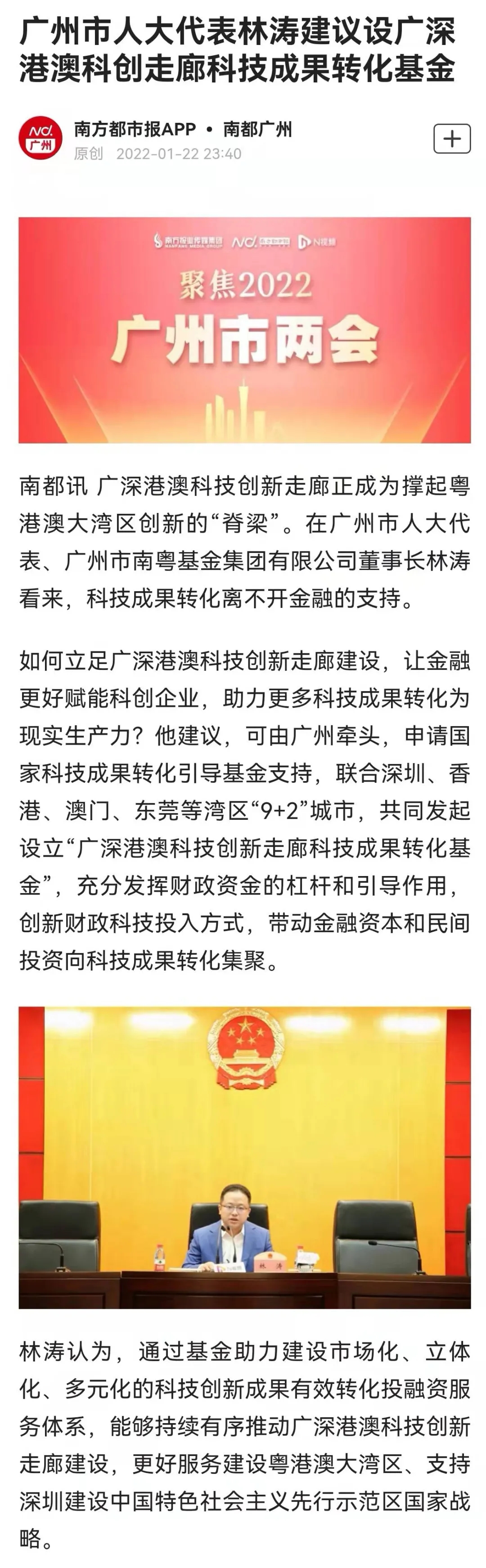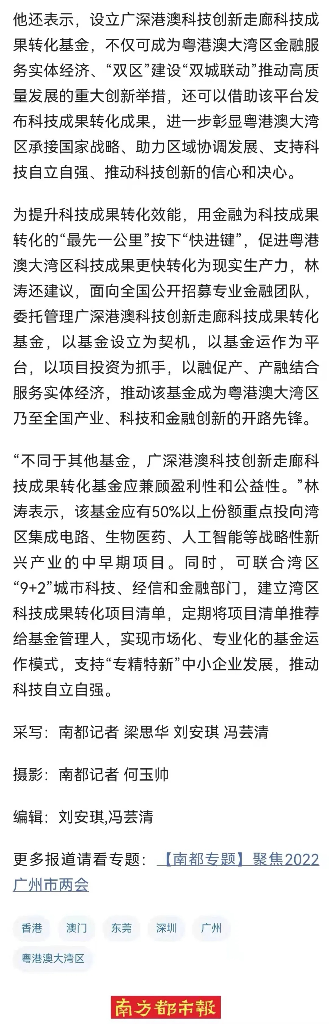 聚焦兩會|《南方都市報》:林濤代表建議設(shè)廣深港澳科創(chuàng)走廊科技成果轉(zhuǎn)化基金