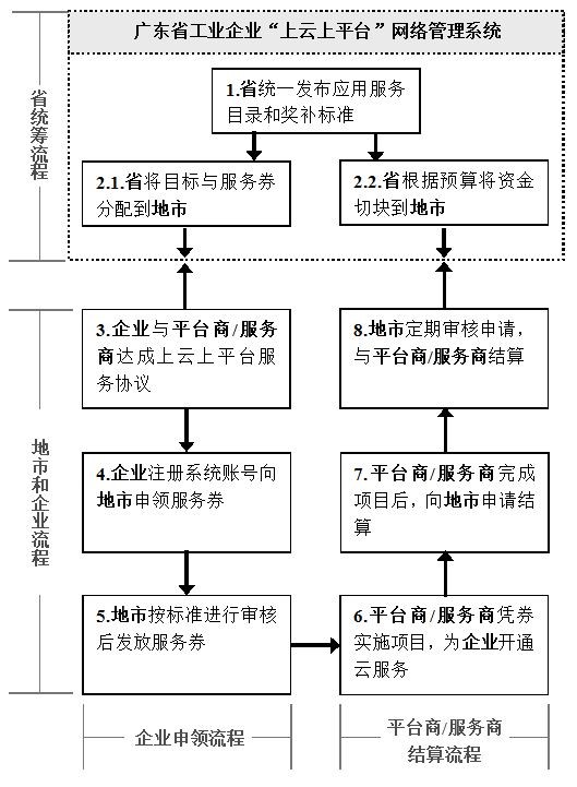 方式:財(cái)政資金支持。省財(cái)政采取服務(wù)券后補(bǔ)助方式,對(duì)工業(yè)企業(yè)“上云上平臺(tái)”費(fèi)用按標(biāo)準(zhǔn)予以獎(jiǎng)補(bǔ)(納入獎(jiǎng)補(bǔ)的應(yīng)用服務(wù)目錄和獎(jiǎng)補(bǔ)標(biāo)準(zhǔn)由省統(tǒng)一制定發(fā)布并按年度更新)。建設(shè)廣東省工業(yè)企業(yè)“上云上平臺(tái)”網(wǎng)絡(luò)管理系統(tǒng),統(tǒng)籌監(jiān)督管理服務(wù)券發(fā)放和資金結(jié)算。服務(wù)券獎(jiǎng)補(bǔ)范圍包括應(yīng)用服務(wù)費(fèi)、設(shè)備接入費(fèi)、網(wǎng)絡(luò)改造費(fèi)等,不包括企業(yè)購(gòu)買自動(dòng)化、智能化設(shè)備等費(fèi)用。(省經(jīng)濟(jì)和信息化委、財(cái)政廳,各地級(jí)以上市人民政府)